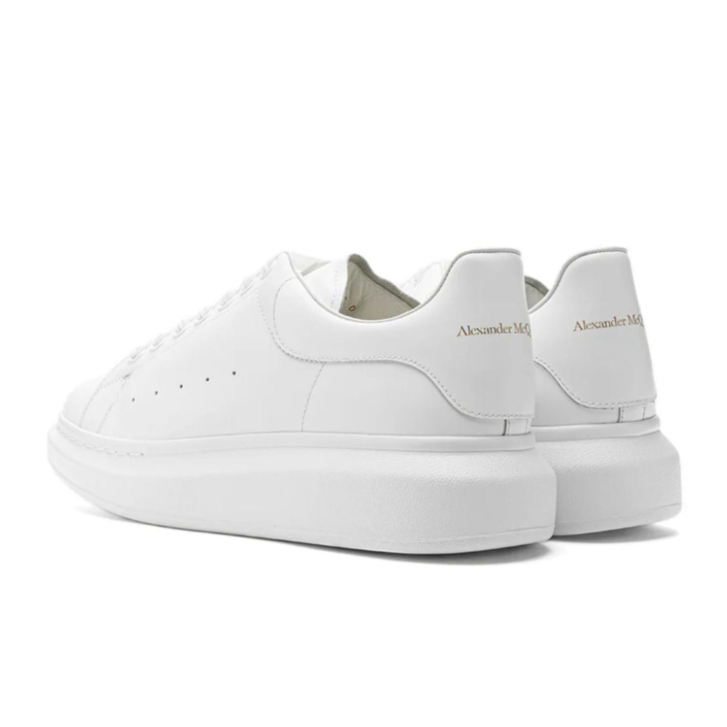 White smooth calf leather sneaker with rounded toe and tonal white heel panel. Perforated air holes, large flat laces and Alexander McQueen signature on tongue and heel. Leather lined. Tonal white oversized rubber sole.